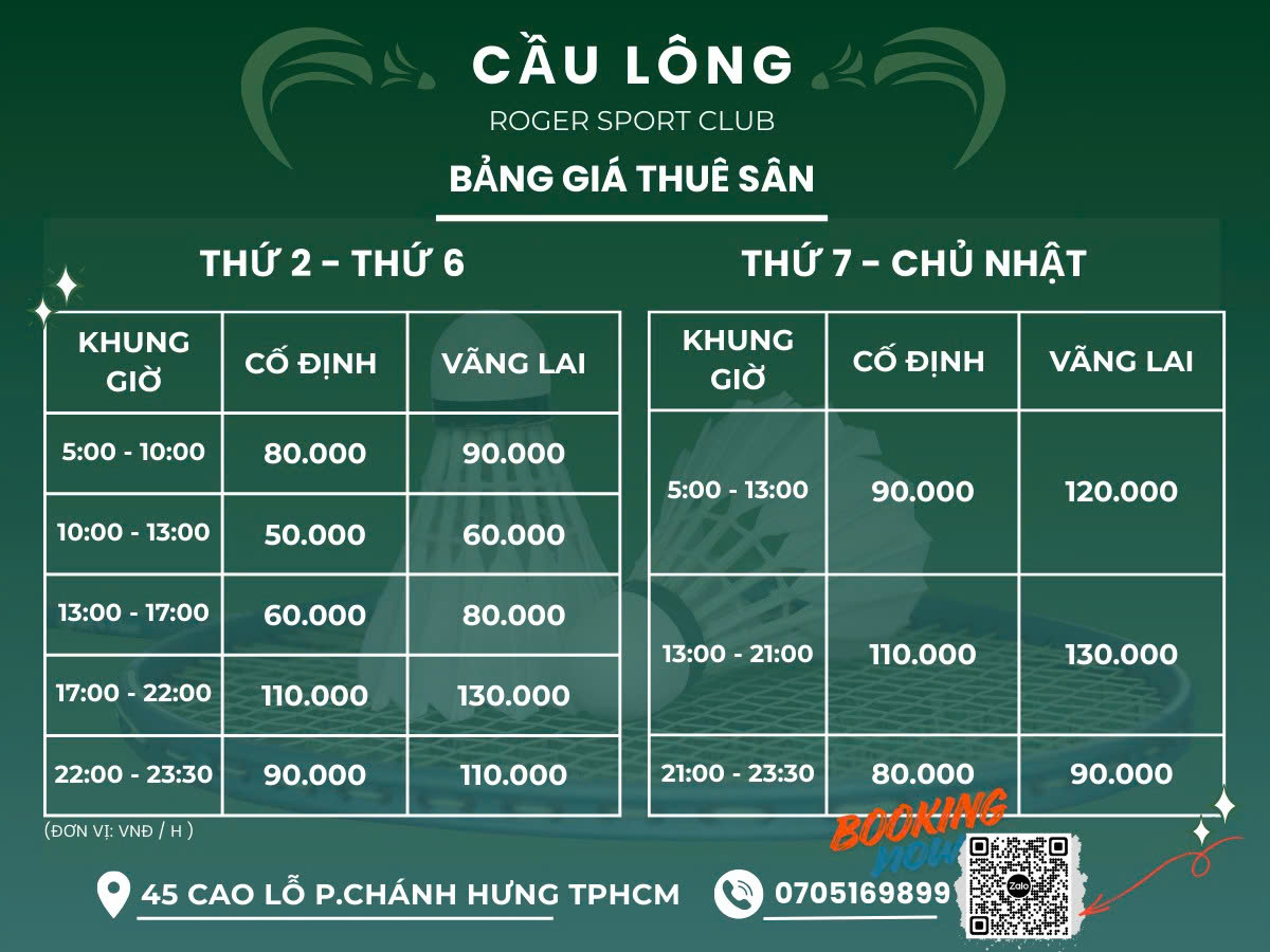- Cầu lông: Sân chuẩn, ánh sáng tốt, phù hợp tập luyện và thi đấu phong trào.